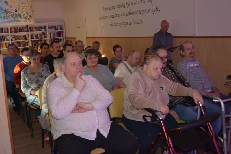 Koncert zaprezentowany tego dnia w naszym Domu nosił tytuł „Powróćmy jak za dawnych lat”. Przybyło na niego wielu naszych Mieszkańców, a towarzyszyła im Pani Dyrektor Agata Nowak. Artyści zagrali i zaśpiewali dla swojej publiczności niezapomniane szlagiery lat dwudziestych i trzydziestych XX wieku. Bez trudu można było wśród nich rozpoznać utwory filmowe, kabaretowe i estradowe. Piosenki takie jak „Miłość Ci wszystko wybaczy”, „Już nie zapomnisz mnie” i „Każdemu wolno kochać” u niejednej osoby przywołały wspomnienia beztroskiej młodości. Nie zabrakło także tanga, walców oraz utworów do tańców towarzyskich. Wspólnie z artystami przenieśliśmy się w czasie do krainy elegancji i piękna. Publiczność nagrodziła koncert gromkimi brawami. Z kolei Pani Dyrektor Agata Nowak, w podziękowaniu za niesamowity występ, przekazała zespołowi upominek wykonany przez naszych Mieszkańców podczas zajęć terapeutycznych. Na zakończenie spotkania nie zabrakło oczywiście wspólnego zdjęcia z całym składem Wędrownego Teatru Muzycznego.