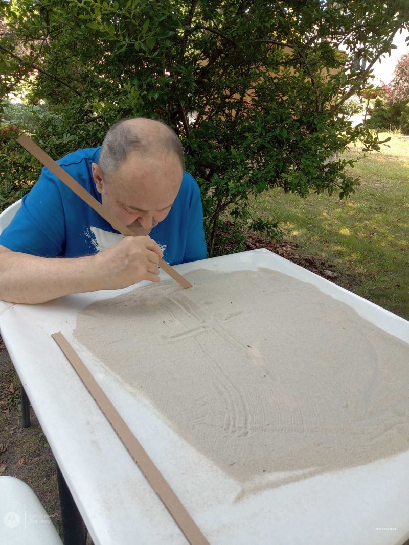 • Pan Adam postanowił porysować na najprawdziwszym piasku z plaży.